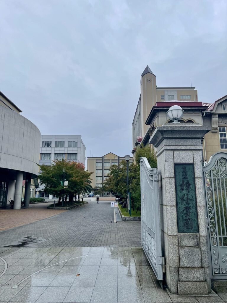 放出出身の私ですが、近鉄線に乗って河内永和で降りたのは初めてです。ここ最近、天気がよかったのに「なぜ今日に限って雨…?」と思いながら、大阪樟蔭女子大学へ向かいました。用水路が続く正門までの道で川邉先生にばったりお会いしてご挨拶。「なるほど!」と反り返りながら開会寸前、お忙しそうでした。