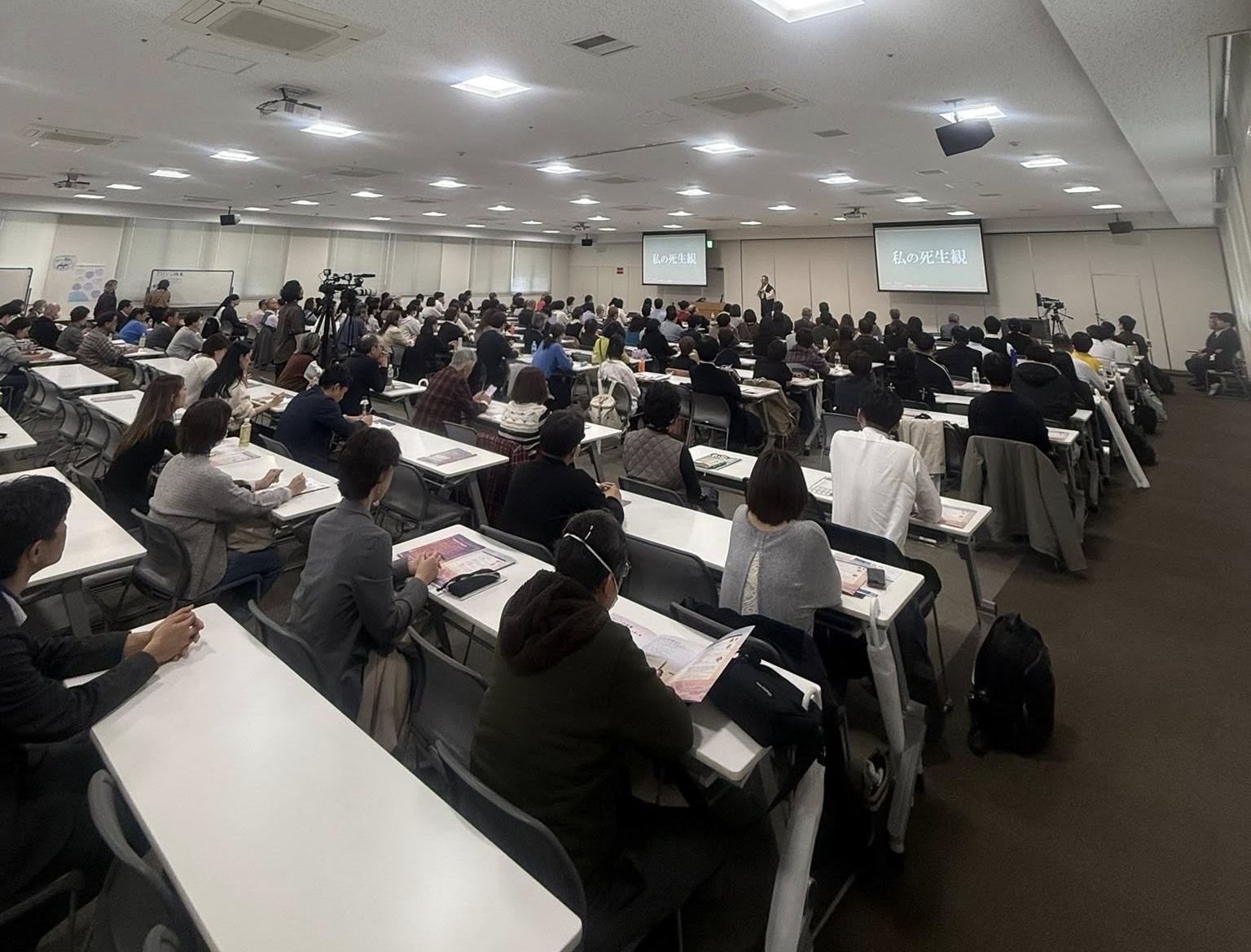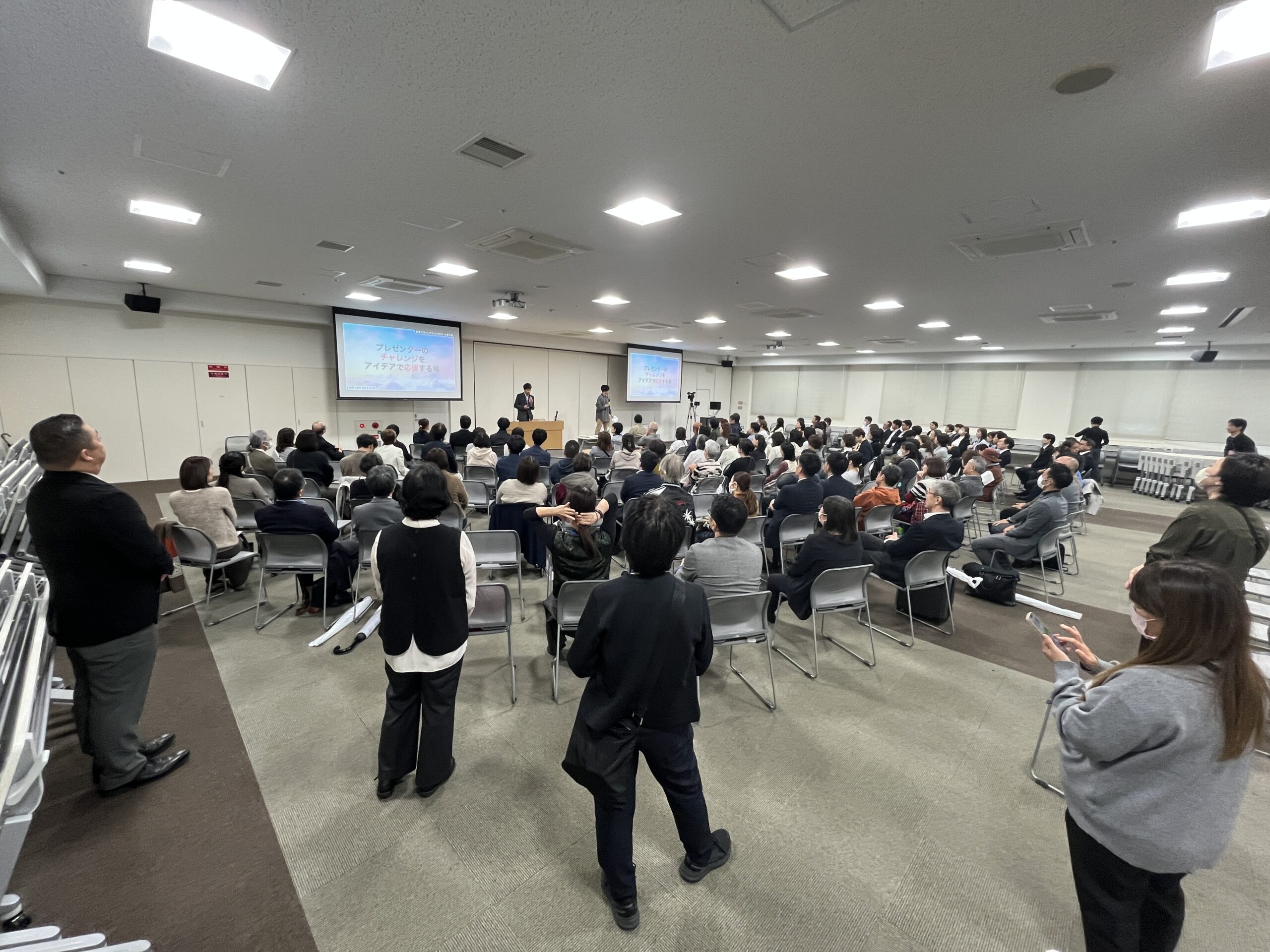 会場の導線ごとに案内の方が立っていたので、10階の席まではスムーズに到達できました。まだオープン30分前で、最前列に着席したため、後で振り返るとすでに満席近い状態になっていて驚きました。